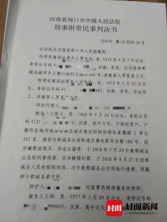 2020年1月16日,周口中院一审判决,被告人王修文犯强奸罪,判处死刑,缓期两年执行,剥夺政治权利终身。王祥犯帮助毁灭、伪造证据罪,判处有期徒刑三年。
