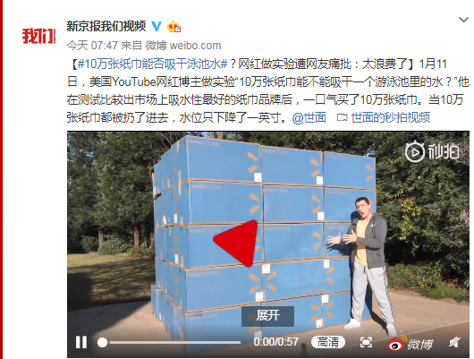 1月11日,美国YouTube网红博主做实验“10万张纸巾能不能吸干一个游泳池里的水?”他在测试比较出市场上吸水性最好的纸巾品牌后,一口气买了10万张纸巾。当10万张纸巾都被扔了进去,水位只下降了一英寸。