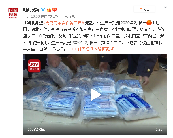 近日,湖北赤壁,有消费者投诉称某药房违法售卖一次性使用口罩。经查实,该药店以每个0.7元的价格通过非法渠道购入1万个伪劣口罩,这批口罩只有两层,起不到保护作用,生产日期是2020年2月6日。执法人员当即下达责令改正通知书,并对库存口罩进行扣押。