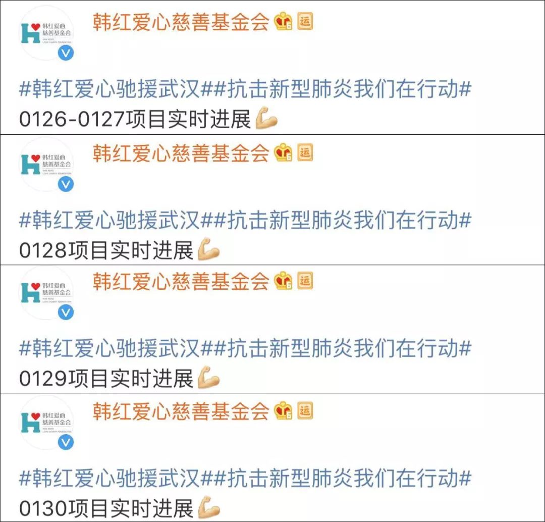 近日,一直以来热心公益的歌手韩红在微博上号召社会捐助,已经5次向武汉送去支援物资。今日凌晨,“韩红爱心慈善基金会”再次公示:筹款总额达到3162万,又有一批新的物资将抵达仓库,进行发放。