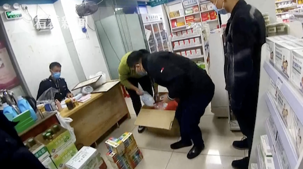 警方将药房内两名涉案嫌疑人黄某和张某带走调查。