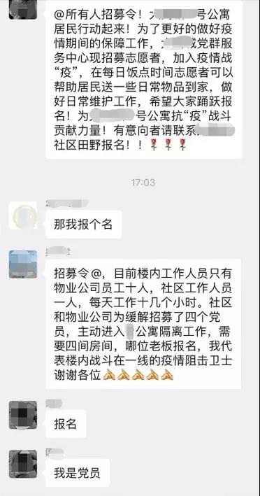 工作人员在逐户登记摸排人员情况时会特别问到是不是党员,一开始有人觉得这一项并没有必要,但后来群里的对话让大家看到了党员的带头带动作用。