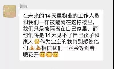 被隔离的人除了在家的业主和租客外,也有不少公寓酒店的住客,甚至还有产妇和待产孕妇。数百人在没有思想准备、没有食品储备的情况下突然困在这里出不去,最点儿背的是有人进楼取东西,前后几分钟就凑巧被隔离在里面。一开始很多人都想逃出去,有些人情绪失控不愿配合,有的人心理恐惧烦躁不安。物业经理为了安抚情绪,提高士气,主动要求进入大楼在隔离区工作,和员工业主一起隔离,同甘共苦,共渡难关。