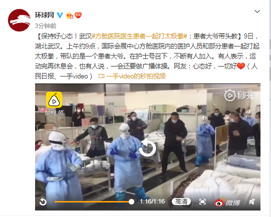 9日,湖北武汉。上午约9点,国际会展中心方舱医院内的医护人员和部分患者一起打起太极拳,带队的是一个患者大爷。在护士号召下,不断有人加入。有人表示,运动完再休息会,也有人说,一会还要做广播体操。网友:心态好,一切好。