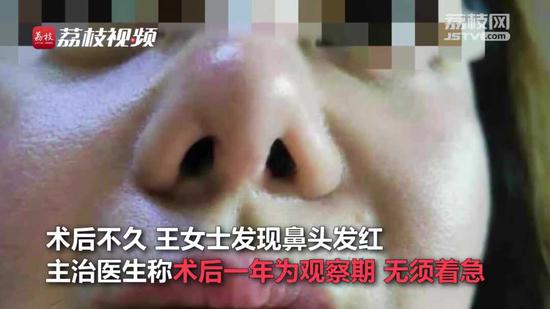 据王女士介绍,当时她经医生推荐,花费11200元接受了“硅胶假体隆鼻术”。术后不久,她发现鼻头发红,类似“草莓鼻”。当时施尔美的主治医生告诉她,隆鼻之后一年内均为观察期,让她不要心急。