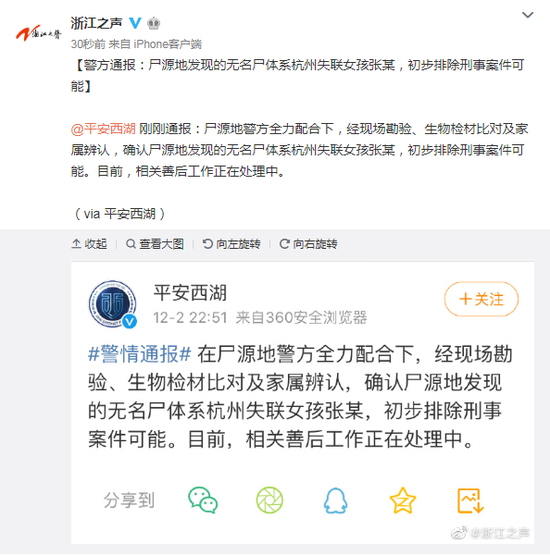 @平安西湖刚刚通报:尸源地警方全力配合下,经现场勘验、生物检材比对及家属辨认,确认尸源地发现的无名尸体系杭州失联女孩张某,初步排除刑事案件可能。目前,相关善后工作正在处理中。