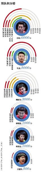 从队员角度分析,男队得分主要集中在许昕(6000分)、马龙(5000分)和樊振东(3000分)3人,他们合力拿下14000分。不出意外,他们将组成东京奥运会男队阵容。
