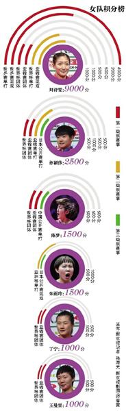 女队方面,刘诗雯豪取9000分一枝独秀,小将孙颖莎拿到2500分,队长丁宁则仅有两项团体赛共1000分入账。