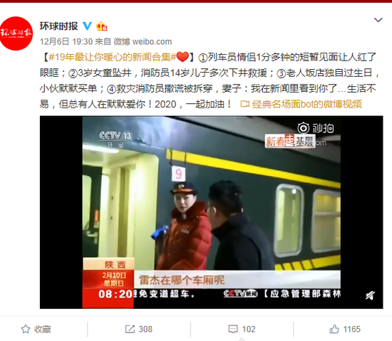 ①列车员情侣1分多钟的短暂见面让人红了眼眶;②3岁女童坠井,消防员14岁儿子多次下井救援;③老人饭店独自过生日,小伙默默买单;④救灾消防员撒谎被拆穿,妻子:我在新闻里看到你了…生活不易,但总有人在默默爱你!2020,一起加油!
