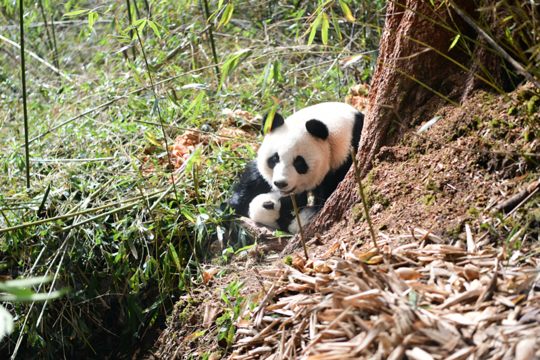 今年3月,大熊猫“乔乔”被送到天台山参与野外引种。4月初,“乔乔”与野生雄性大熊猫成功交配,于9月16日在天台山野外顺利产下一对雄性双胞胎。老二由“乔乔”抚养,老大则被转移到熊猫中心神树坪基地育幼室进行人工育幼。在野外,监测人员通过现场观察、红外相机监测和GPS无线电定位监测,母兽带仔行为良好,幼仔生长发育正常,随着幼仔一天天长大,母兽的活动范围不断扩大,同时离开巢穴采食竹子的时间也在不断增加。