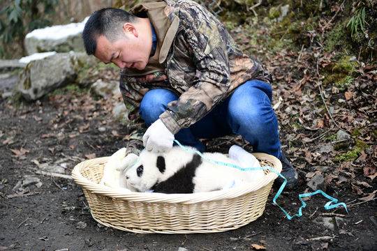 为保证两只幼仔都能吸取到母乳,监测人员在幼仔出生7天后,将两只幼仔进行第一次互换,之后是每个月轮换一次,总共换仔3次,目前是“乔乔”带着老大在野外生活。幼仔现已三月龄。经过几个月的筹备,12月12日上午,熊猫中心科研团队前往卧龙天台山,工作人员经过5个多小时的努力将“乔乔”成功诱捕。为了减少幼仔的应激反应,工作人员身穿涂有“乔乔”气味的工作服,将幼仔抱出天台山野化培训场,随即将“乔乔”母子迅速转运至核桃坪野化培训基地。