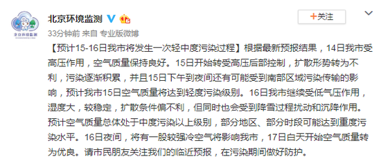 根据最新预报结果,14日我市受高压作用,空气质量保持良好。15日开始转受高压后部控制,扩散形势转为不利,污染逐渐积累,并且15日下午到夜间还有可能受到南部区域污染传输的影响,预计我市15日空气质量将达到轻度污染级别。