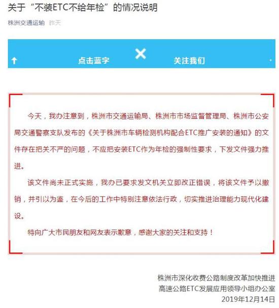 中新网12月15日电 据“株洲交通运输”微信公众号消息,14日,湖南省株洲市深化收费公路制度改革加快推进高速公路ETC发展应用领导小组办公室表示,株洲市交通运输局、株洲市市场监督管理局、株洲市公安局交通警察支队发布的《关于株洲市车辆检测机构配合ETC推广安装的通知》的文件存在把关不严的问题,不应把安装ETC作为年检的强制性要求,下发文件强力推进。