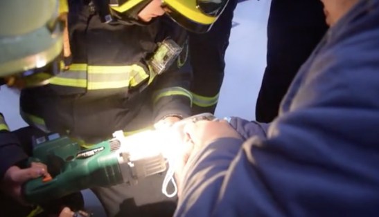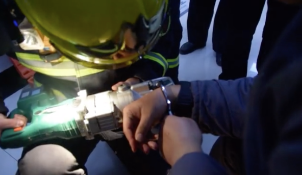 消防员首先检查了一下男子手部的情况,没有挤压红肿,手铐和手腕之间有一定的缝隙,但可控操作的空间不大。