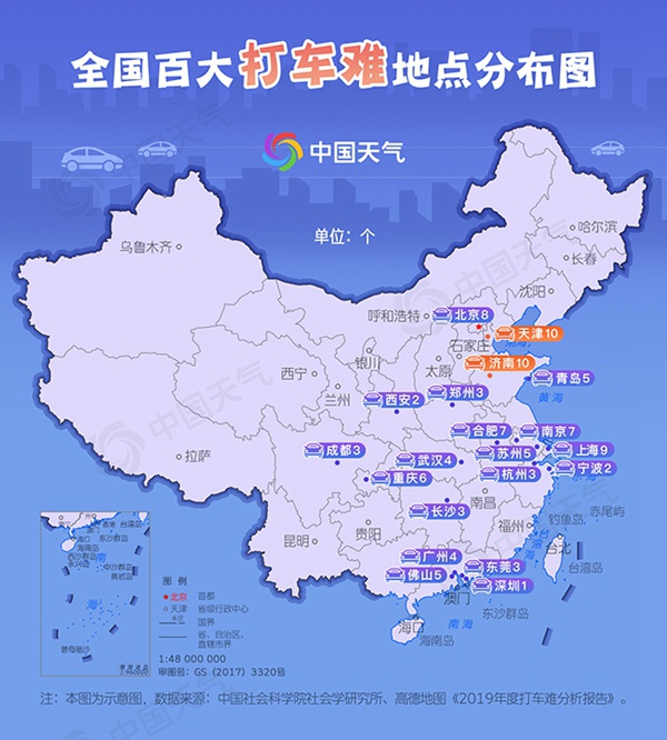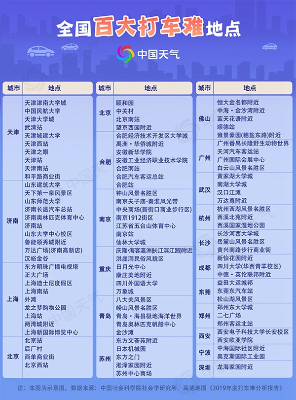 众所周知,恶劣天气仅是打车难的一个因素而已,打车难还受区域、路况、时段等多方面因素的影响。高德地图与中国社会科学院社会学研究所联合发布的《2019年度打车难分析报告》显示,2019年全国主要城市100个打车难地点主要集中在华北和华东地区。其中,天津市和济南市各有10个地点上榜,在全国主要城市中数量最多。综合来看,今日打车最难城市为天津,“打车难等车更难”,既有打不到车的绝望,也有等车挨冻的崩溃。