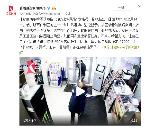 当地时间12月14日,俄罗斯西伯利亚地区一个加油站遭劫。监控显示,劫匪拿着防狼喷雾闯入店内,朝店员一阵猛喷,店员夺门而逃后,劫匪在店内四处搜寻现金,期间一名女员工返回店内试图阻止劫匪,劫匪再次拿出喷雾防身,不料却喷错方向,让自己中了招,最终被手持拖把的女店员赶出门。据了解,这名劫匪抢走了7000卢比(约690元人民币)现金,目前警方正在追捕该男子。