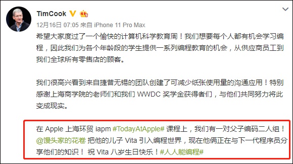 微博上“8岁小学生教你学编程”的话题已经超过百万阅读量。12月16日,Vita君过8岁生日,苹果公司CEO库克亲自给他送上生日祝福。