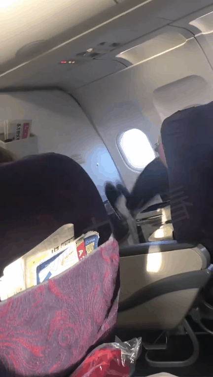 把穿着拖鞋的双脚蹬到了飞机舱壁上