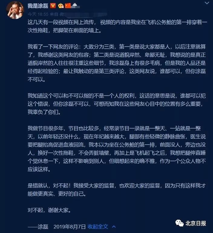 对于这次的不当行为,我感到十分愧疚。在此诚恳地向大家道歉,作为公众人物今后必将严于律己加以改正,给大家添麻烦了。对不起。