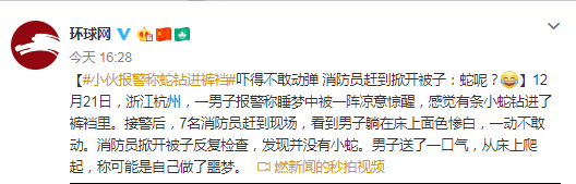 12月21日,浙江杭州,一男子报警称睡梦中被一阵凉意惊醒,感觉有条小蛇钻进了裤裆里。接警后,7名消防员赶到现场,看到男子躺在床上面色惨白,一动不敢动。消防员掀开被子反复检查,发现并没有小蛇。男子送了一口气,从床上爬起,称可能是自己做了噩梦。