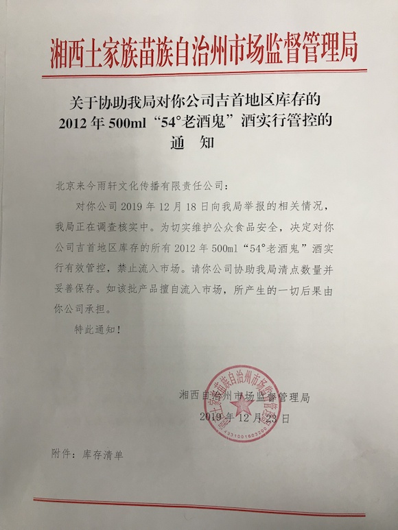 在湘西州市场监管局出具的相关通知中写道:为维护公众食品安全,决定对请你公司吉首地区库存的所有2012年500ml“54度老酒鬼酒”实行有效控制,禁止流入市场。请你公司协助我局清点数量并妥善保管。如该批次产品擅自流入市场,所产生的一切后果由你公司承担。