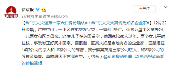 12月22日凌晨,广东中山,一小区住宅突发火灾,一家6口身亡。死者为屋主区某夫妇、一儿两女和区某母亲。21岁儿子在英国留学,他回家陪家人过年。两个女儿平时住校,事发时正好周末回家。据报道,区某夫妇是当地有名的企业家,区某担任14家公司的法人和18家公司的高管,妻子蔡某英是三家公司法人,和8家公司的股东及高管。事故原因正在调查中。(综合)@新京报动新闻