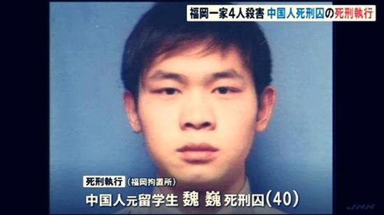 据共同网报道,日本法务省12月26日宣布,当天上午对2003年杀害福冈市一家四口、因抢劫杀人罪等被判死刑的中国籍留学生魏巍(40岁)执行了死刑。