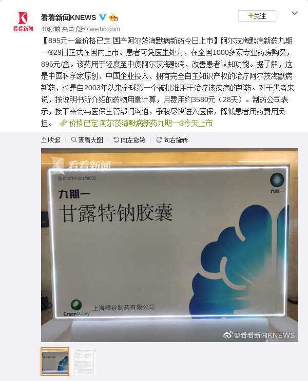 阿尔茨海默病新药九期一®29日正式在国内上市。患者可凭医生处方,在全国1000多家专业药房购买,895元/盒。该药用于轻度至中度阿尔茨海默病,改善患者认知功能。据了解,这是中国科学家原创、中国企业投入、拥有完全自主知识产权的治疗阿尔茨海默病新药,也是自2003年以来全球第一个被批准用于治疗该疾病的新药。对于患者来说,按说明书所介绍的药物用量计算,月费用约3580元(28天)。制药公司表示,接下来会与医保主管部门沟通,争取尽快进入医保,降低患者用药费用负担。