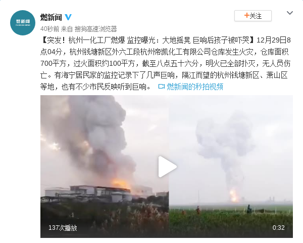 12月29日8点04分,杭州钱塘新区外六工段杭州帝凯化工有限公司仓库发生火灾,仓库面积700平方,过火面积约100平方,截至八点五十六分,明火已全部扑灭,无人员伤亡。有海宁居民家的监控记录下了几声巨响,隔江而望的杭州钱塘新区、萧山区等地,也有不少市民反映听到巨响。