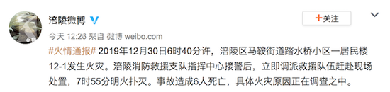 据重庆市涪陵区委宣传部消息,2019年12月30日6时40分许,涪陵区马鞍街道踏水桥小区一居民楼12-1发生火灾。