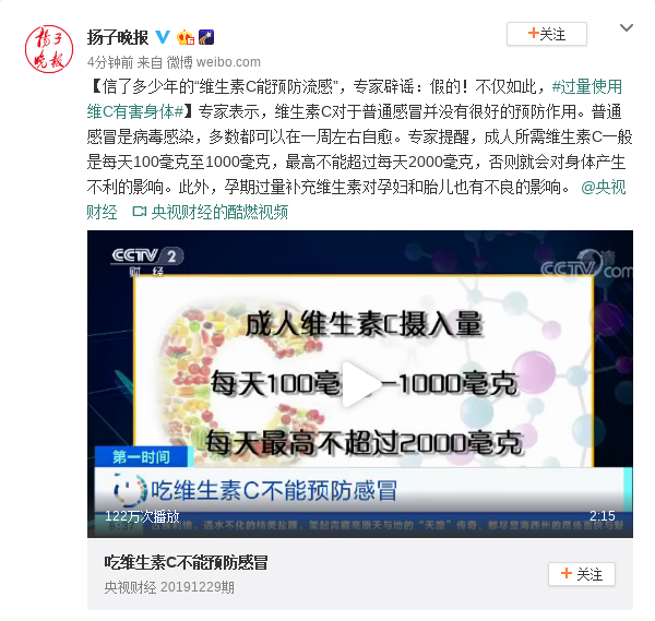 专家表示,维生素C对于普通感冒并没有很好的预防作用。普通感冒是病毒感染,多数都可以在一周左右自愈。专家提醒,成人所需维生素C一般是每天100毫克至1000毫克,最高不能超过每天2000毫克,否则就会对身体产生不利的影响。此外,孕期过量补充维生素对孕妇和胎儿也有不良的影响。