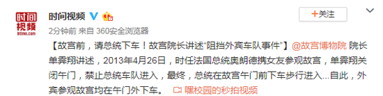 @故宫博物院 院长单霁翔讲述,2013年4月26日,时任法国总统奥朗德携女友参观故宫,单霁翔关闭午门,禁止总统车队进入,最终,总统在故宫午门前下车步行进入。自此,外宾参观故宫均在午门外下车。