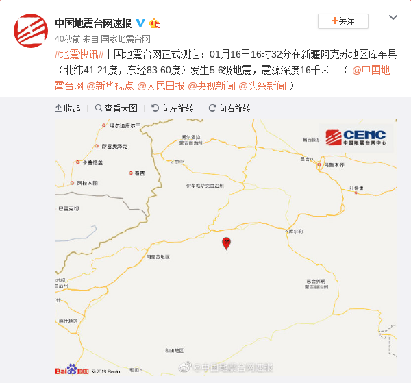 #地震快讯#中国地震台网正式测定:01月16日16时32分在新疆阿克苏地区库车县(北纬41.21度,东经83.60度)发生5.6级地震,震源深度16千米。
