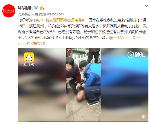 1月18日,浙江衢州,16岁的少年杨子铖听闻有人溺水,扒开围观人群前去施救,发现溺水者是自己的爷爷,已经没有呼吸。杨子铖在学校通过考试拿到了救护员证书,给爷爷做心肺复苏加人工呼吸,挽回了爷爷的生命。