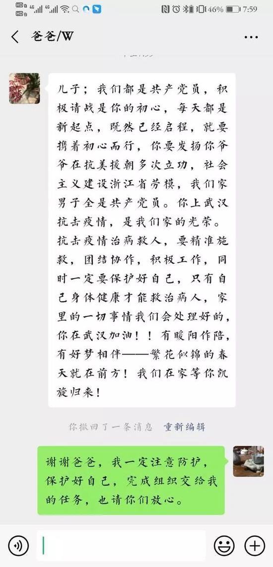 来自杭州市红十字会医院结核科的胡钦医生,昨晚接到要出征的信息后,老父亲发微信来嘱托和鼓劲,他的爷爷是抗美援朝的老英雄,他们家是个光荣的党员家庭。