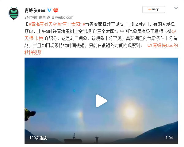 2月9日,有网友发视频称,上午9时许青海玉树上空出现了“三个太阳”。中国气象局高级工程师卞赟@天师-卡赞 介绍称,这是幻日现象,该现象十分罕见,需要满足的气象条件十分苛刻,并且幻日现象持续时间很短,只能在很短的时间内观察到。