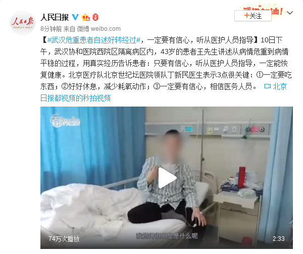 10日下午,武汉协和医院西院区隔离病区内,43岁的患者王先生讲述从病情危重到病情平稳的过程,用真实经历告诉患者:只要有信心,听从医护人员指导,一定能恢复健康。北京医疗队北京世纪坛医院领队丁新民医生表示3点很关键:①一定要吃东西;②好好休息,减少耗氧动作;③一定要有信心,相信医务人员。