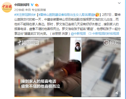 2月7日,雷神山医院交付的前一天,中建安装雷神山项目前线副总指挥罗文浩的女儿出生,而他却不能陪在家人身边。那时,罗文浩已连续几天没有好好休息过,接到家人的报喜电话,疲惫不堪的他喜极而泣。罗文浩给孩子起名“媛涵”,他想和孩子一起分享这份“援建武汉”的光荣。