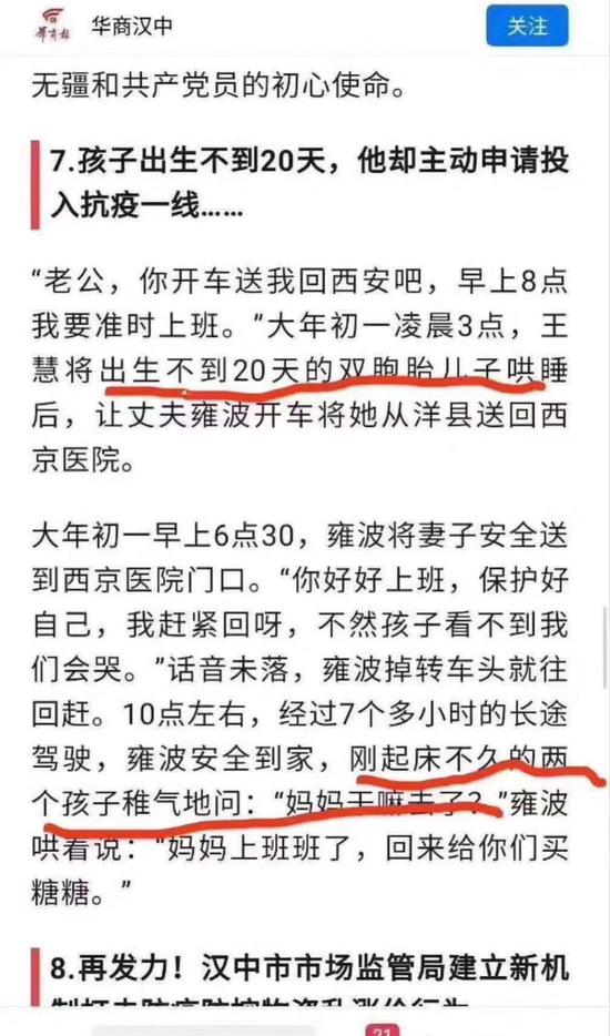 2月15日,“华商汉中”头条号刊发了稿件《孩子出生不到20天,他却主动申请投入抗疫一线……》,其中包含了三个抗疫一线的感人故事。稿件的标题,是以第三个故事——洋县辅警杨浪在孩子出生不到20天,即主动要求到疫情检查点执勤的内容拟定的。而本文的第一个故事,是西京医院消化科护士王惠在大年初一即辞别不到两岁的双胞胎儿子,返岗工作的感人事迹。