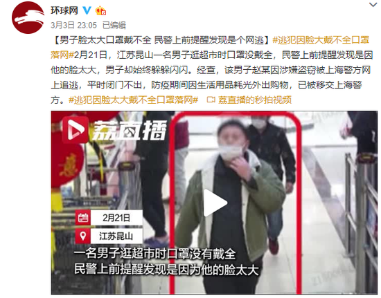 2月21日,江苏昆山一名男子逛超市时口罩没戴全,民警上前提醒发现是因他的脸太大,男子却始终躲躲闪闪。经查,该男子赵某因涉嫌盗窃被上海警方网上追逃,平时闭门不出,防疫期间因生活用品耗光外出购物,已被移交上海警方。