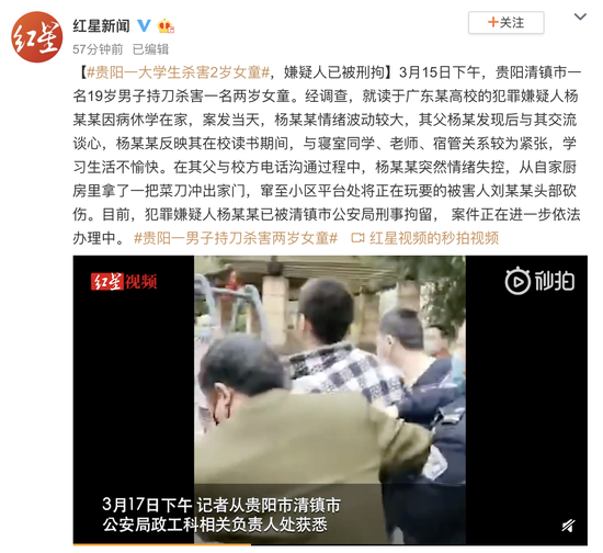 3月15日下午,贵阳清镇市一名19岁男子持刀杀害一名两岁女童。经调查,就读于广东某高校的犯罪嫌疑人杨某某因病休学在家,案发当天,杨某某情绪波动较大,其父杨某发现后与其交流谈心,杨某某反映其在校读书期间,与寝室同学、老师、宿管关系较为紧张,学习生活不愉快。在其父与校方电话沟通过程中,杨某某突然情绪失控,从自家厨房里拿了一把菜刀冲出家门,窜至小区平台处将正在玩要的被害人刘某某头部砍伤。目前,犯罪嫌疑人杨某某已被清镇市公安局刑事拘留, 案件正在进一步依法办理中。