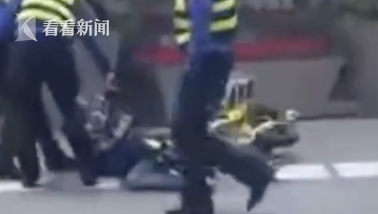 视频中,一名外卖小哥躺在地上,紧紧抱着电动车,在他的身旁,多名穿着市容巡查制服的工作人员连人带车拽起,准备把外卖员的电动车拖走。在纠缠过程中,外卖小哥腿部疑似因拖行受伤。