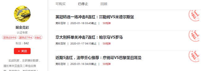 其中掘金竞彩在昨日的英冠比赛中顺利命中富勒姆赢球,达成八连红,他将继续冲刺9连红![掘金竞彩豪取8连红状态上佳]