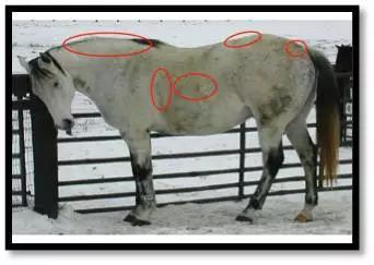 库兴氏综合征(cushing‘s syndrome)也叫“垂体中部功能异常”(PPID),在老年马中常见。患这种病的马常常以体表被毛长而卷曲为特征,甚至在夏季都不蜕毛。病马还伴有肌肉减少,腹部下垂,饮水量增加,尿量增加,出汗量也增加。由于该病也会引起肥胖、局部脂肪聚积,胰岛素含量也会增高,因此很容易和EMS混淆。