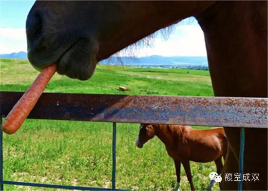 胡萝卜是马儿的最爱。爱马人也爱用胡萝卜来调教、奖赏、逗引马儿。