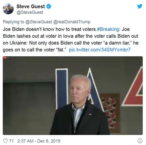 然而,这个听起来颇有些人身攻击意味的词——“胖子”,迅速吸引了共和党的“火力”。报道称,共和党全国委员会的史蒂夫·盖斯特(Steve Guest)在推特上写道,“乔·拜登不知道如何对待选民……拜登不仅称选民是‘该死的骗子’,还称选民是‘胖子’。”↓