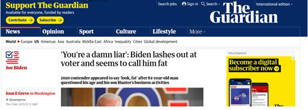 《卫报》称,随着对话的继续进行,拜登接下来似乎对这位选民说了句,“听着,胖子”(look,fat)。