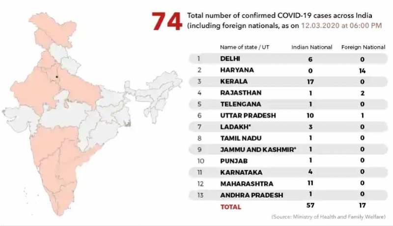 印度拥有13亿人口,近期确诊病例数量不断增加,从上周日约30例飙升至现在74例,全国各地陆续出现病例。