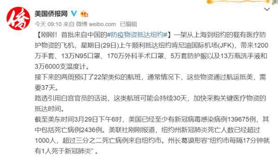 《纽约时报》报道称,一架来自上海的飞机29日抵达纽约,机上载有80吨医疗物资,包括手套、口罩、防护服和其他医疗设备。