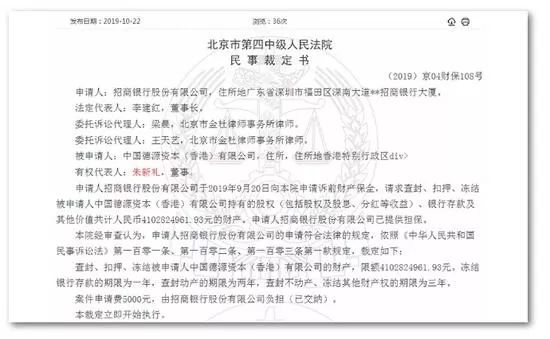 近日,中国裁判文书网的一份民事裁定书显示,招商银行股份有限公司曾于2019年9月20日向法院申请诉前财产保全,请求查封、扣押、冻结中国德源资本(香港)有限公司持有的股权、银行存款及其他价值共计人民币41.03亿元财产。